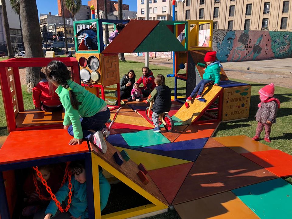 Tuvimos la oportunidad de trabajar junto con un grupo de diez colaboradores/as y los/as integrantes de dos cooperativas de viviendas de Ciudad Vieja (Puerto Fabini y La Kolonia) que venían planteando la necesidad de equipar con juegos infantiles la Plaza Canillita (Plazoleta OIT), entonces hemos estudiado y construido esta divertida estructura de juego que atrajo a más niños/as y adultos de lo que imaginábamos.